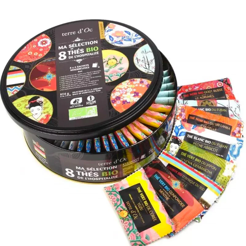 Ce coffret est composĂ© de 48 sachets de thĂ© : thĂ© blanc bio pĂȘche abricot de Chine, thĂ© noir bio Ă la cannelle de Sri Lanka, thĂ© noir bio aux agrumes goĂ»t russe, thĂ© vert bio Ă la menthe de Touareg, thĂ© blanc bio fleur dâoranger de Chine et thĂ© vert bio genmaĂŻcha du Japon. Chez Terre dâOc, tous les thĂ©s sont 100 % biologiques et sont issus de rĂ©coltes manuelles.